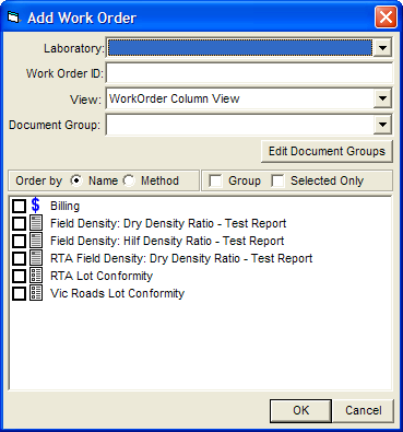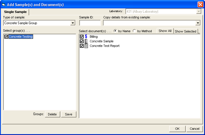 Step 2. The Add Sample(s) and Document(s) window is displayed. Ensure the correct laboratory is chosen, then select Concrete Sample Group from the Type of Sample to be added.
