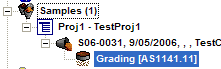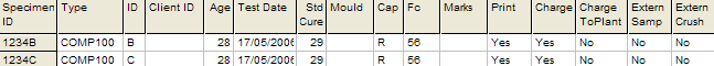In the QESTLab tree the concrete sample group is displayed with the concrete sample(s) 'hanging' off. In the example the concrete sample group is highlighted and shows the client, project and date cast. There is only one concrete sample in the example, but there may be many concrete samples, one for each fieldsheet for that project for that day. It is shown with the fieldsheet number, mix code, time sampled, and number of specimens i.e. cylinders.