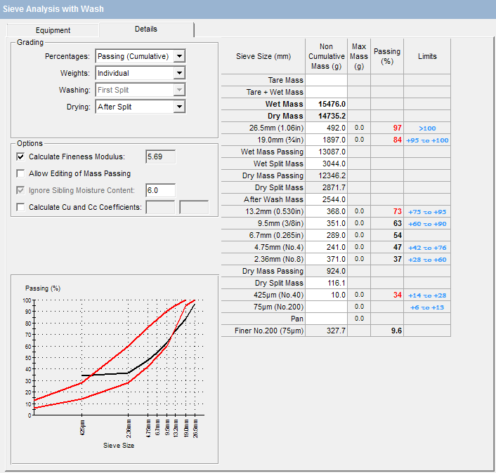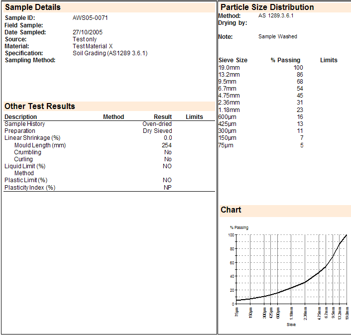When the Document-Level Option "PSD Non Classified AS 1289.3.6.1 Chart" is set to True, the Standard Aggregate/Soil Test Report displays the Particle Size Distribution graph in conformance with AS 1289.3.6.1 Section 8.