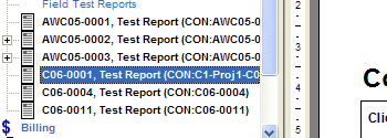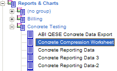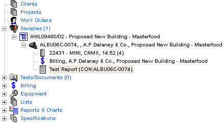 Notice the two other documents displayed at the same level as the concrete sample document. These document are the concrete test report document, and the QESTLab billing document. These are normally added whenever a concrete sample group is registered. The concrete test report is used to report concrete test results, and the billing document is used to store charges associated with the sample, for inclusion on an invoice at the end of the month.