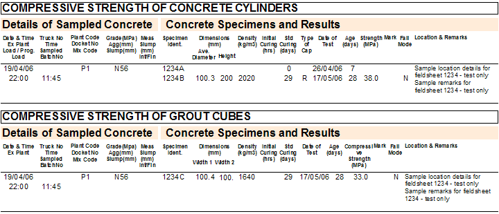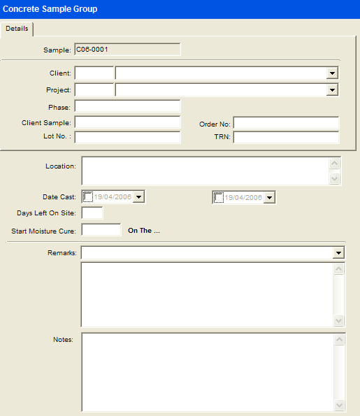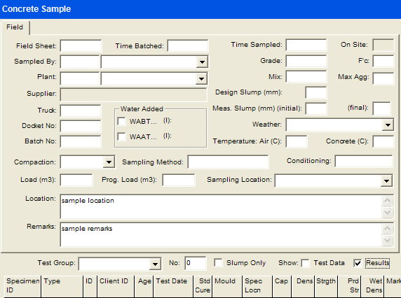 1. The concrete sample group level contains, as the name suggests, information that is applicable to a group of concrete samples taken from the same project on a particular day. This includes the client, project and date cast, as well as other information.