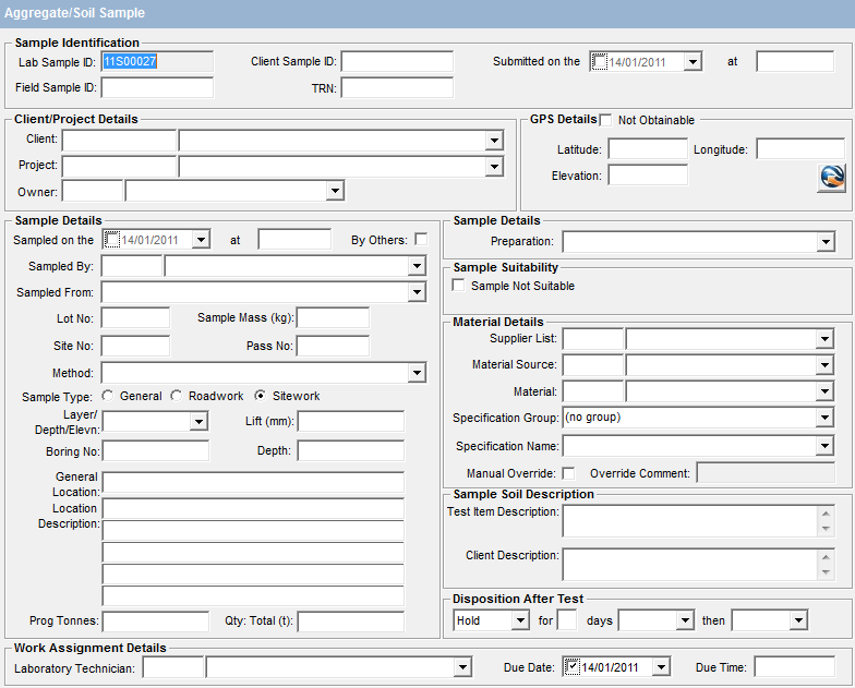 - Client - you will need the client 'Coffey Geotechnics' for that laboratory (eg. Coffey Geotechnics Albury). The first time you do testing for this laboratory you may need to request this client be added by head office in the same way other clients are added.