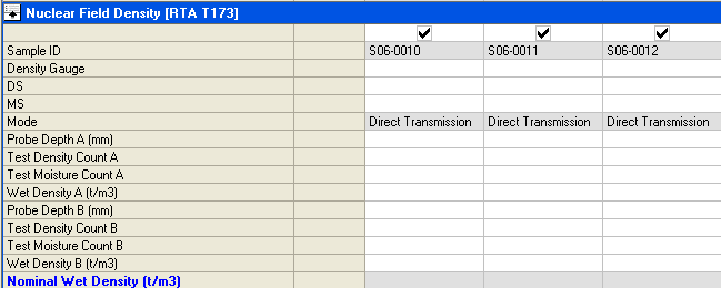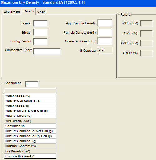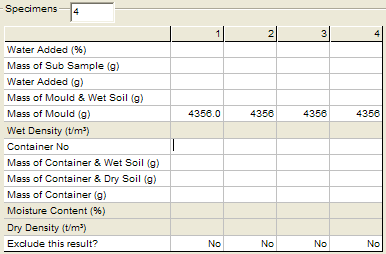 Enter the raw data (masses). Final test results are calcuated and displayed. The columns in this grid are always the same, they are: