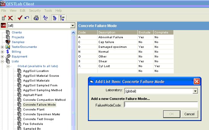 Lists QESTLab lists allow you to maintain lists of commonly used items, such as concrete plants, aggregate/soil materials, tester names, and many others. This makes data entry faster and simpler. Lists are displayed and maintained under the lists node.