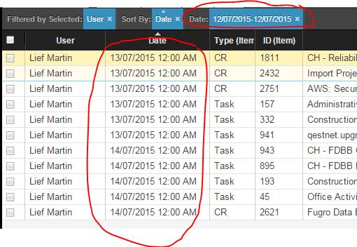 The result - the date listed in the filter bar is different to what was selected (12/7 vs 13/7). The results listed are different again (13/7 to 14/7):