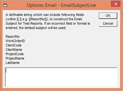 From here, a subject can be created following the instructions, that utilises the fields shown in the prompt, as long as they are within "[[]]". For example, "Test Report: [[ReportNo]] for [[ClientName]], [[ProjectName]]" would be a valid format.
