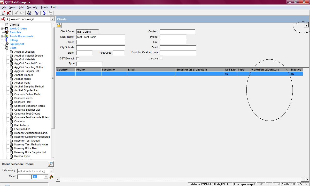 When the Preferred Laboratory button is ON then the entries are restricted to those Clients that have the Preferred Laboratory option set the same as the current laboratory (in this case Lane Cove West Laboratory). Refer images below.